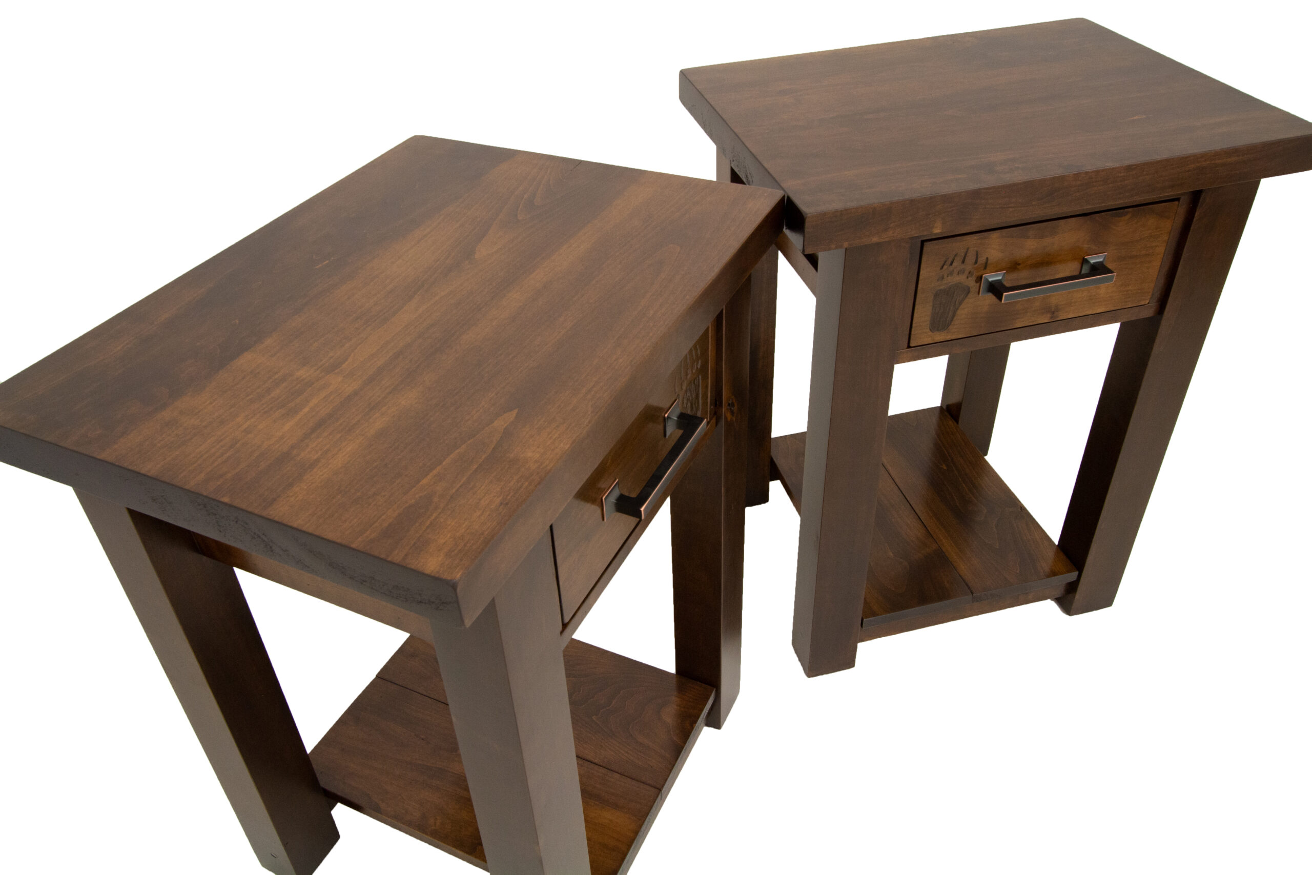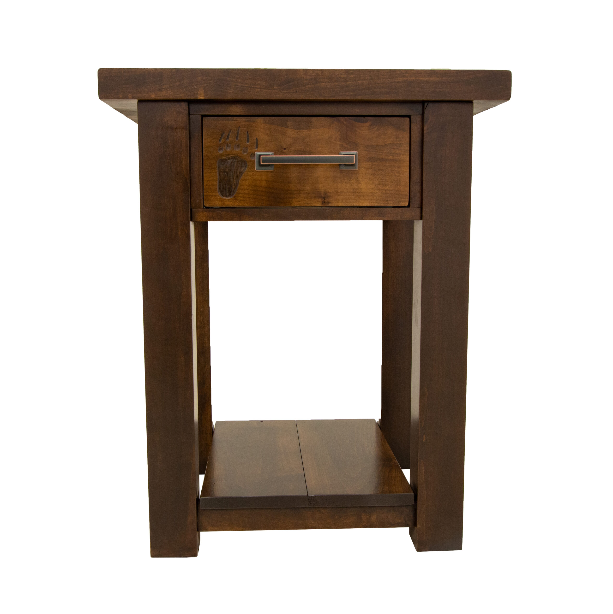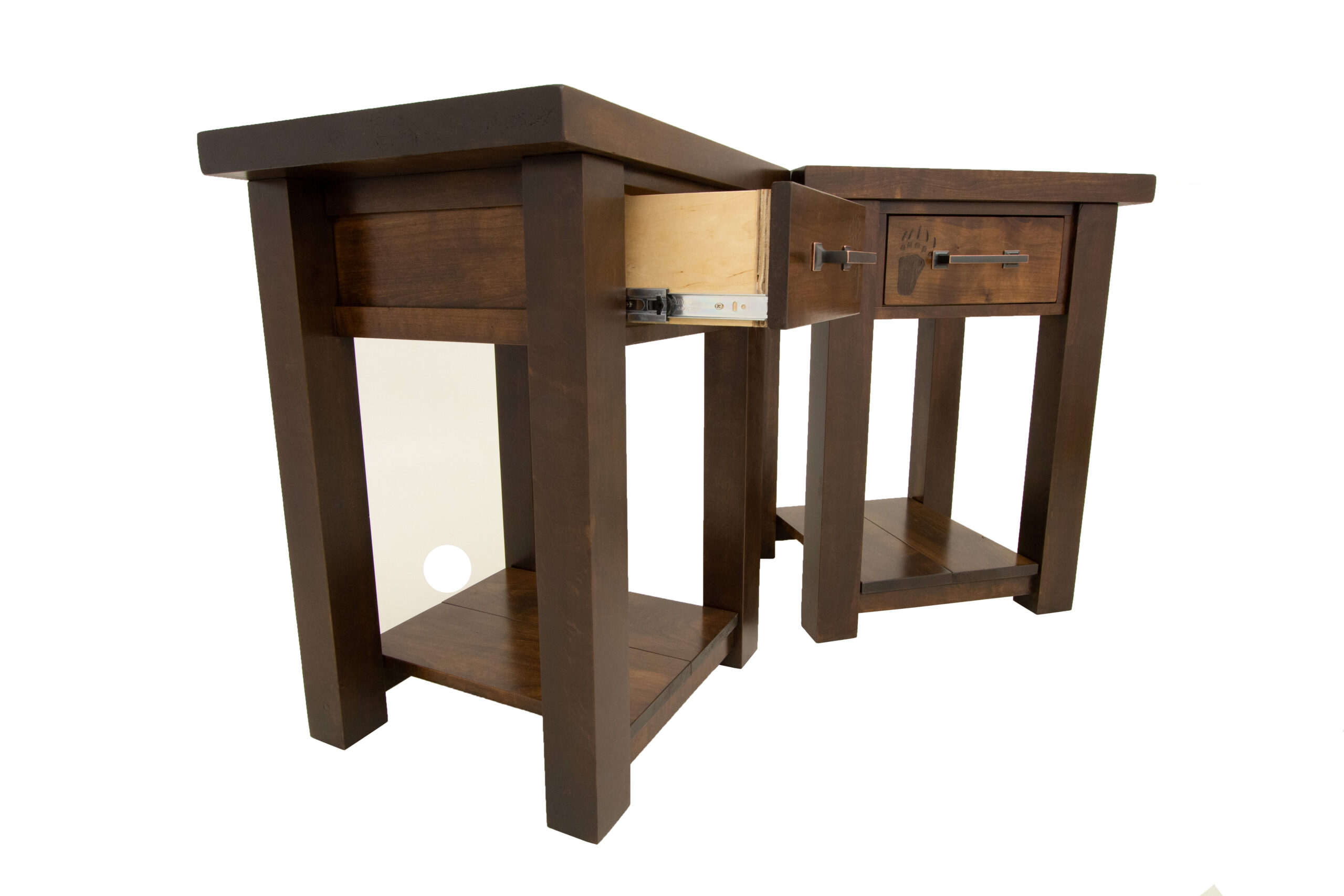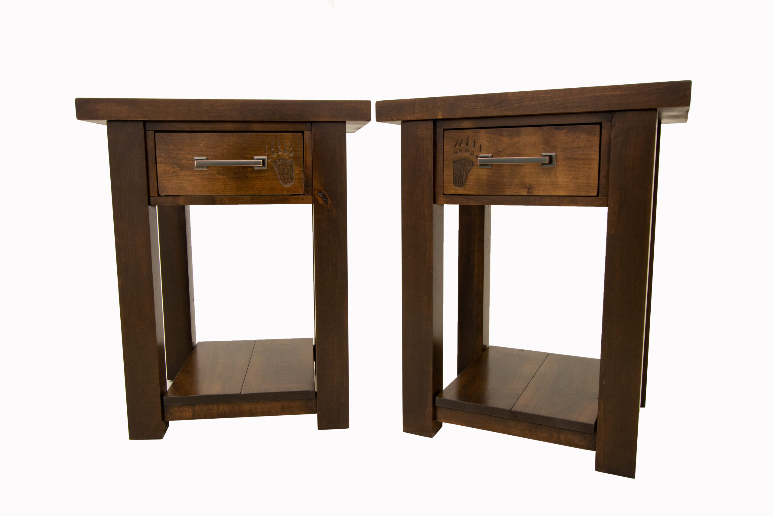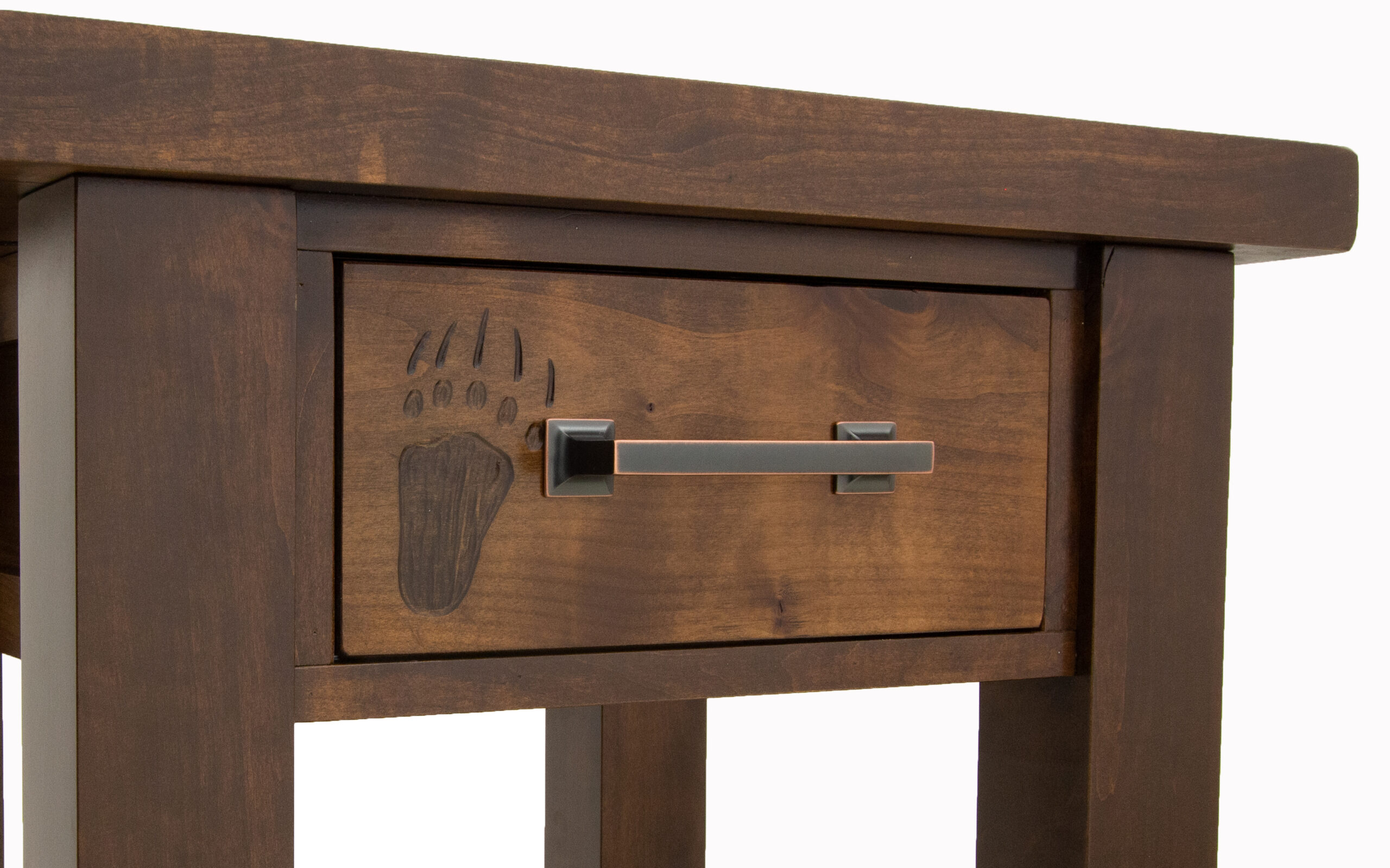 Our Big Bear nightstand features a bear paw hand carved into the drawer front by a local artisan who has been carving in the valley for decades. The big bear nightstand is part of our big bear furniture collection. Each piece will feature a hand carved element to it. The big bear bedroom collection is made here at our factory in Bozeman, Montana so you can expect quality and know that you’re buying a piece that will last a lifetime. The big bear nightstand is finished with a pre-catalyzed lacquer that adds an eye catching sheen that also serves to protect the source wood even further. Designed and manufactured by Four Corner Furniture in Bozeman, Montana, our one drawer big bear nightstand ships directly from our workshop to your front door.+