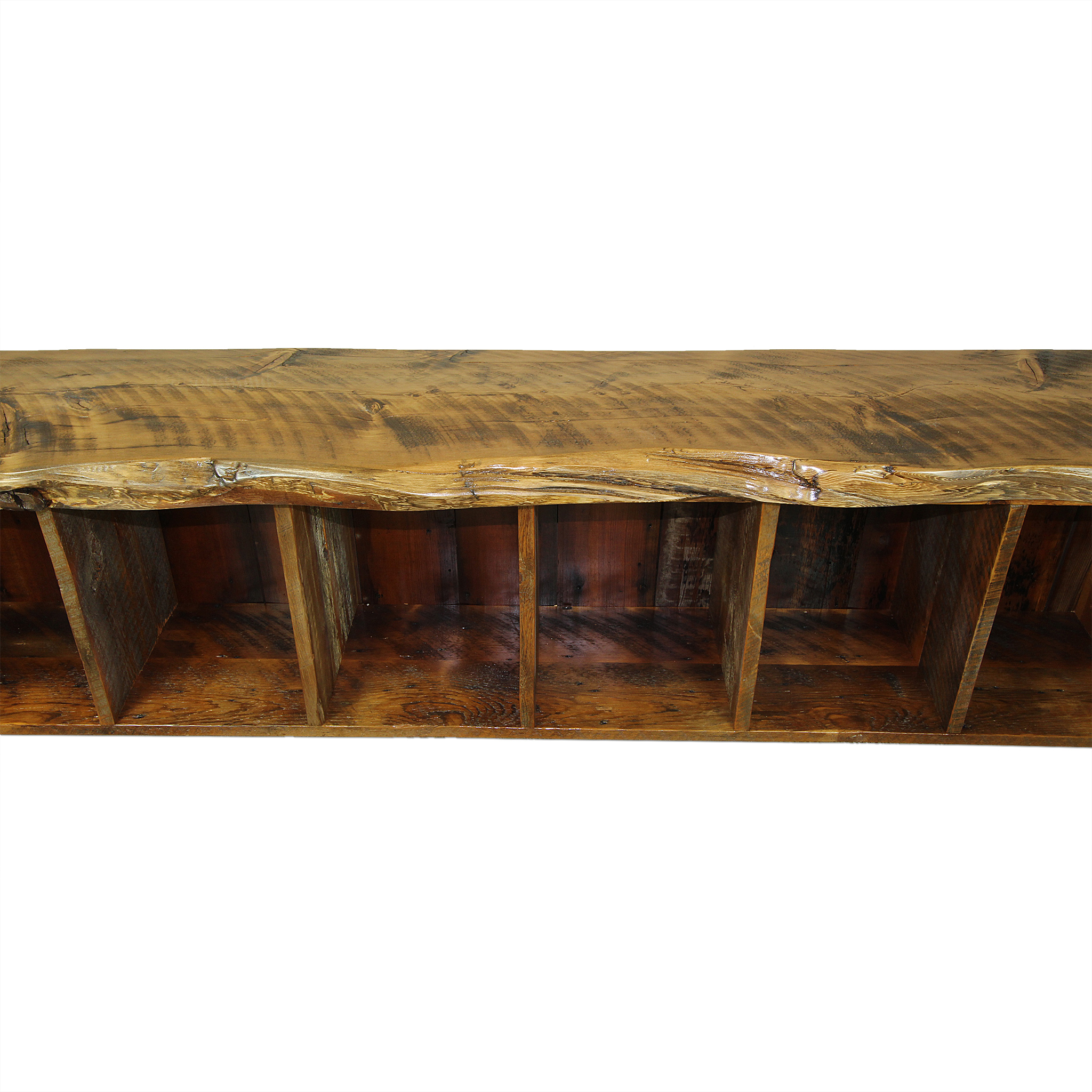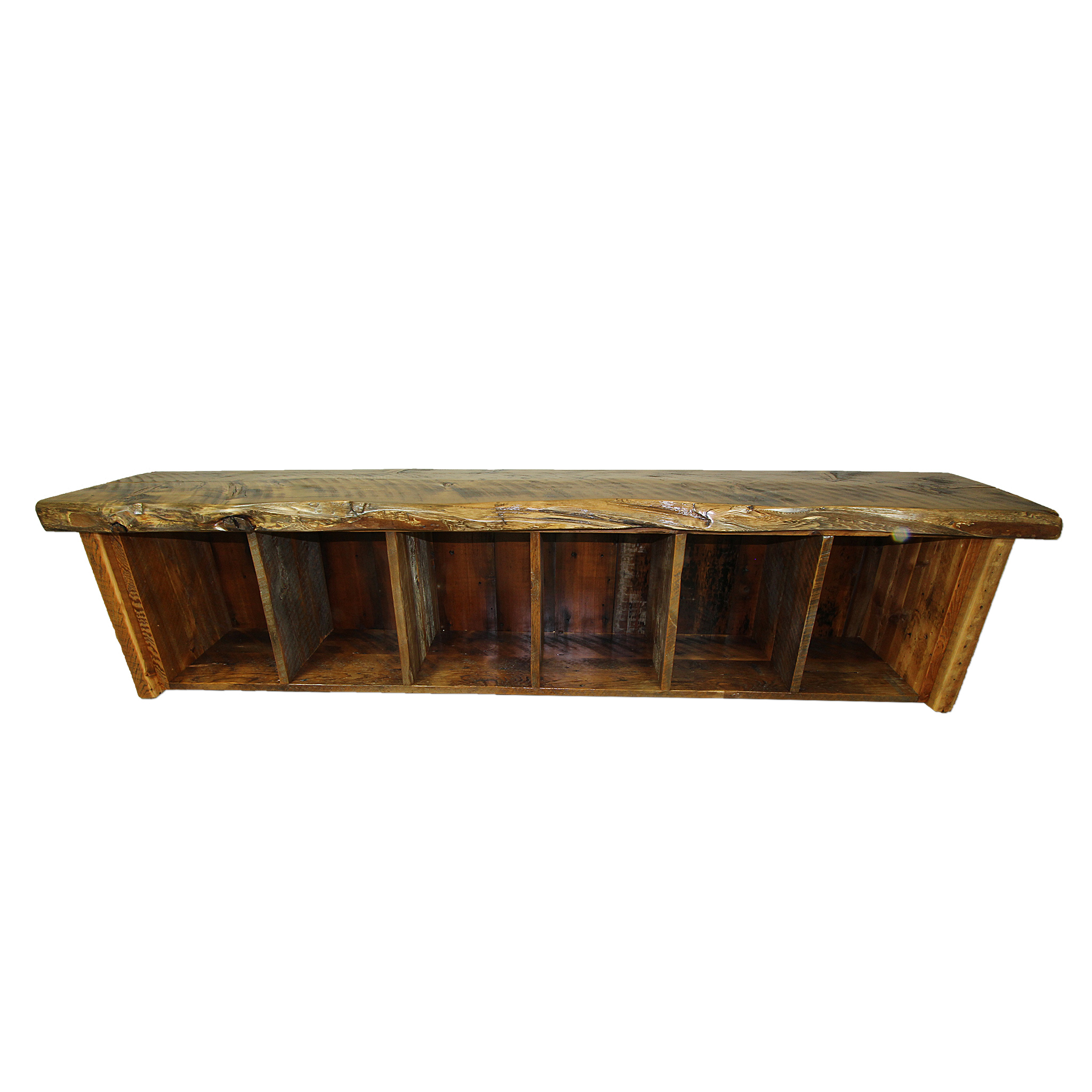 A rustic addition perfect for any mudroom or entryway, the live edge rustic storage bench from Four Corner Furniture offers beautifully designed convenience that anyone can appreciate. A comfortable place to sit and remove shoes and boots. This bench doubles as storage for footwear thanks to the several cubbies that form its base. Constructed out of reclaimed barnwood and new circle sawn fir for long lasting durability, this bench is handcrafted and made to order by a meticulous team of dedicated furniture makers. A pre-catalyzed lacquer finish covers each live edge rustic storage bench for additional beauty and structural durability.