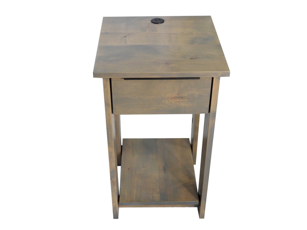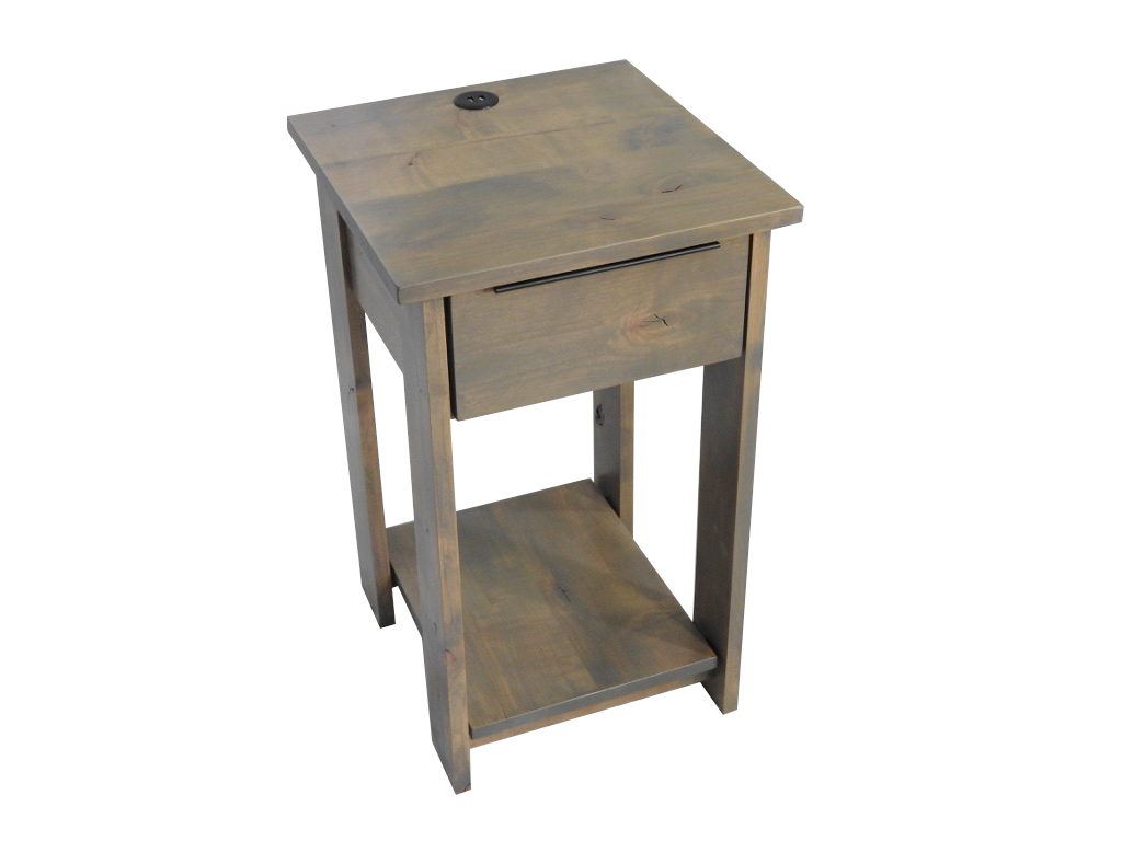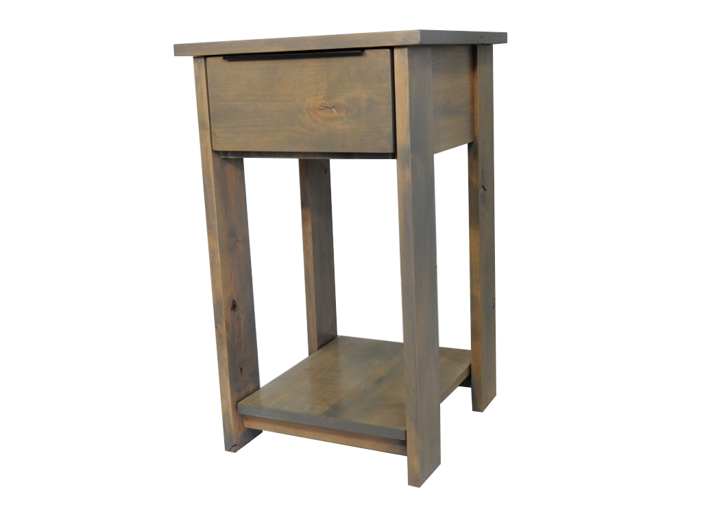 Edgy yet functional, our modern rustic 1 drawer nightstand is the perfect example of this mix of styles. Sleek and useful this nightstand is built by experienced furniture builders based at our shop in Bozeman, Montana. The piece is made from a combination of alder and new wood for long lasting strength and durability. We coat the nightstand in a pre-catalyzed lacquer finish for additional structural support and to help highlight the underlying wood’s natural shine. In an effort to uphold the highest of quality standards, our team at Four Corner Furniture makes every piece of furniture by hand and as ordered. Our modern rustic 1 drawer nightstand features a top shelf, pull out drawer, and lower storage shelf, to make sure you have plenty of space for bedside essentials. Shown in our Smoke stain.