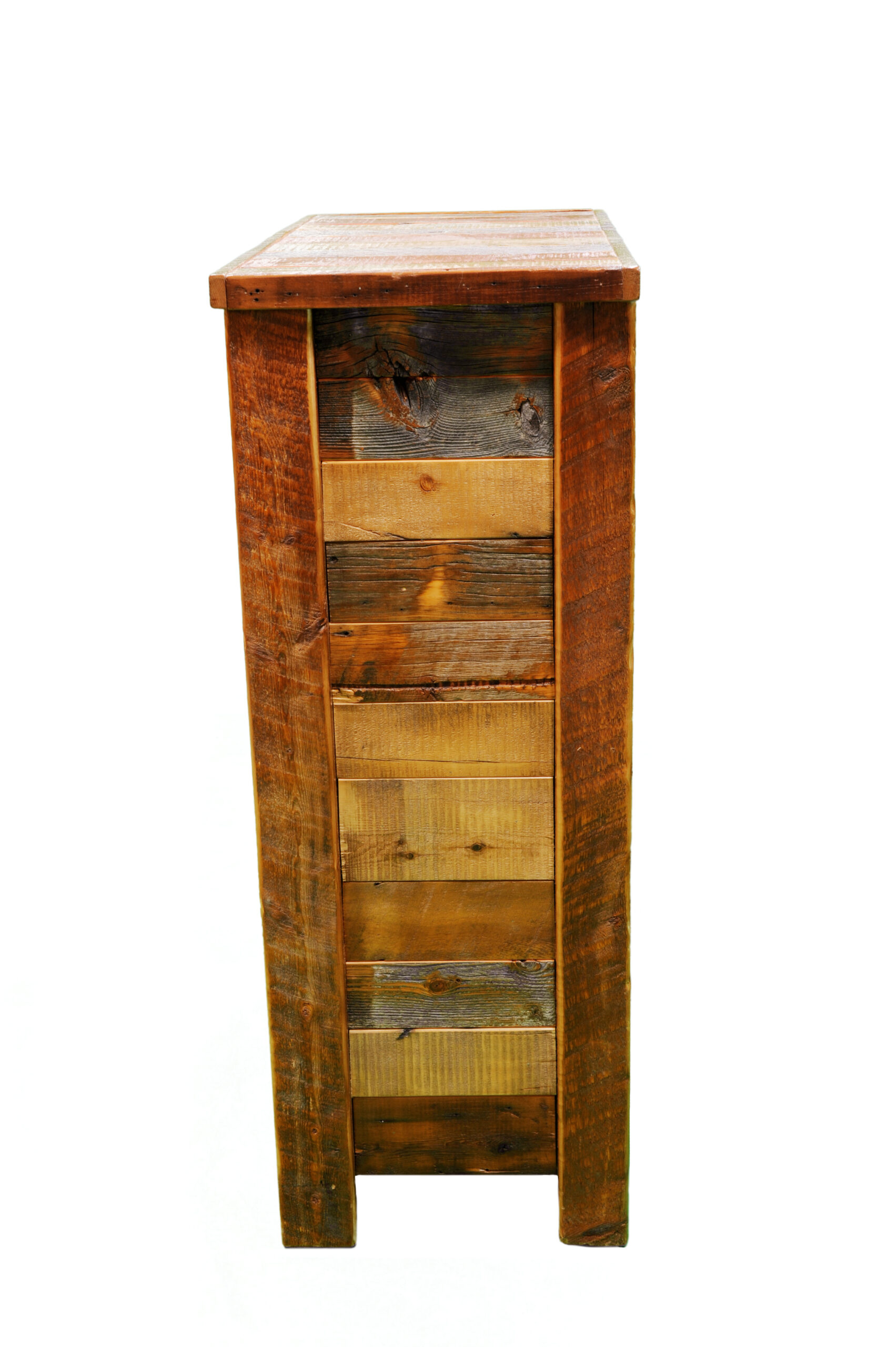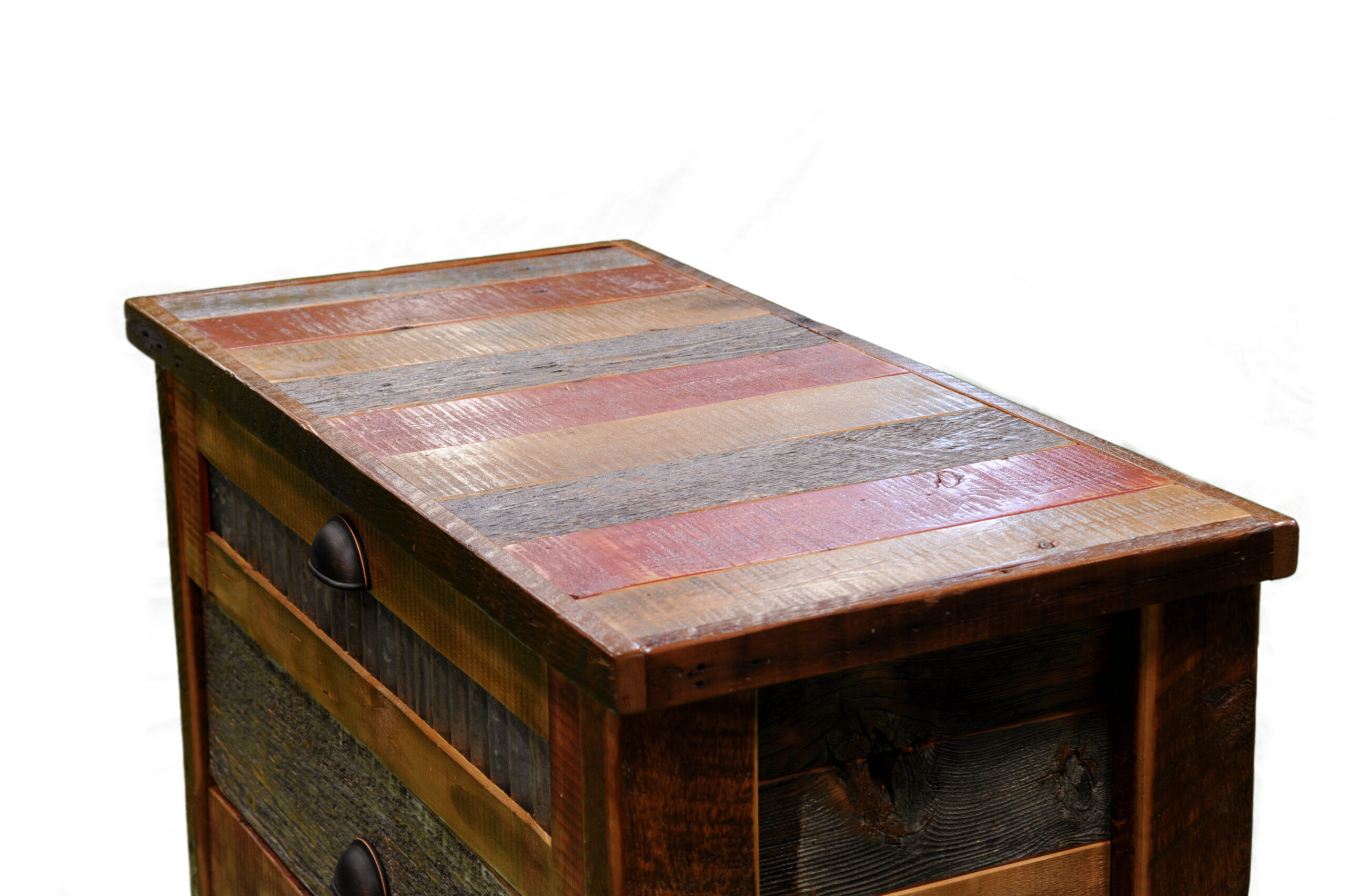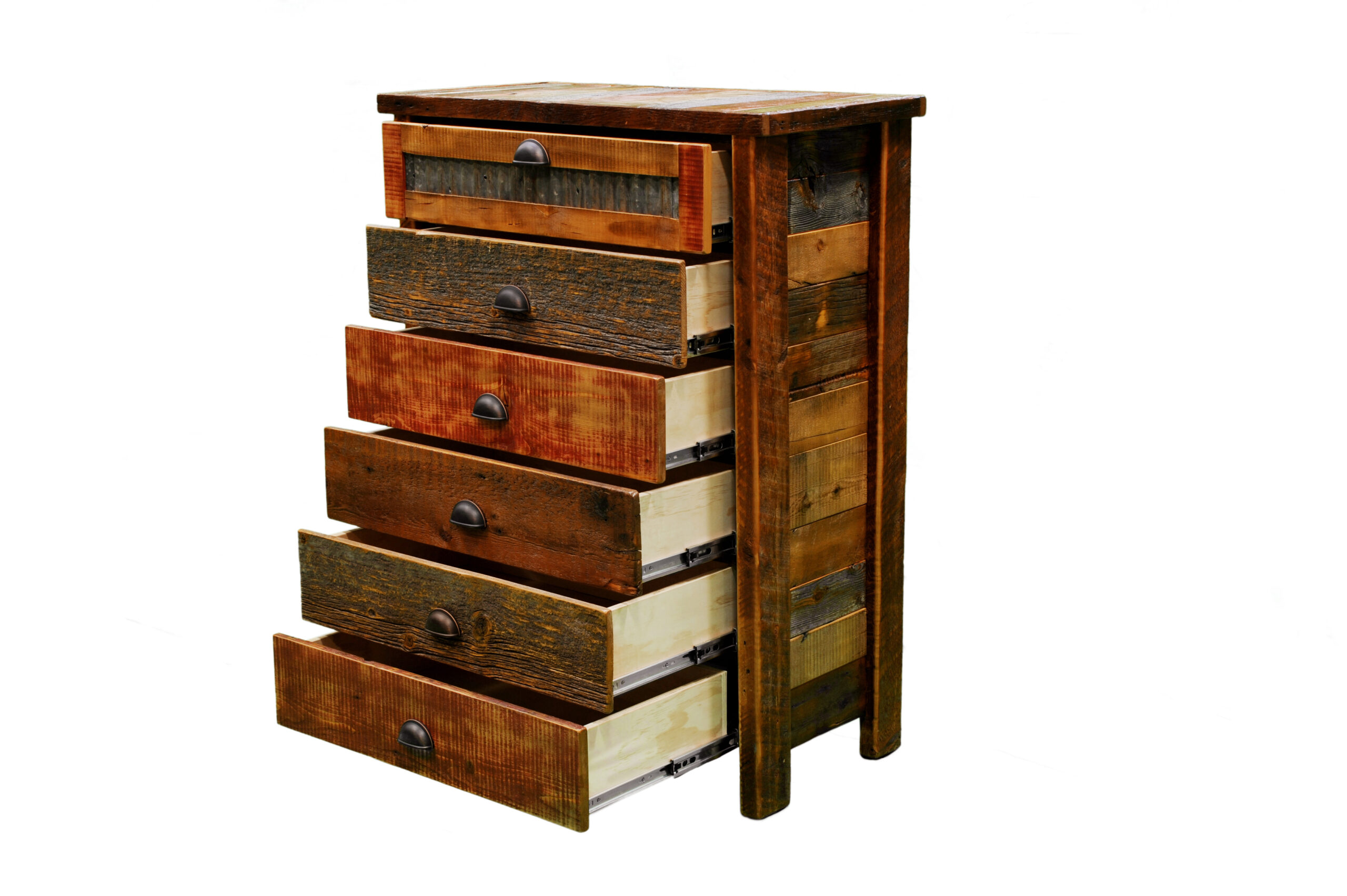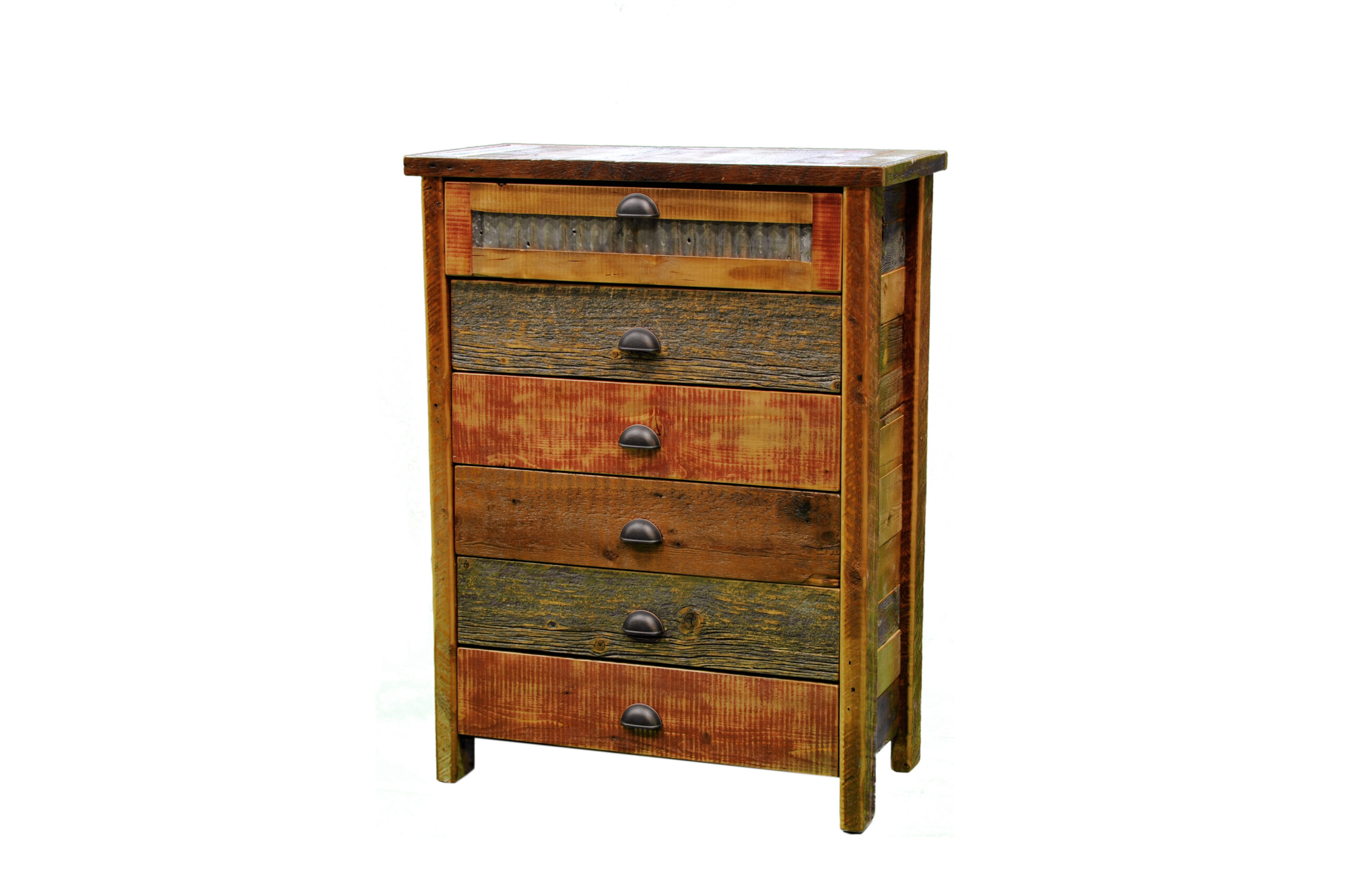 Rustic and functional, this reclaimed wood chest with tin arizona is the ideal combination any Americana enthusiast. So, why not invest in a dresser that you can enjoy? The reclaimed wood chest with tin arizona is truly a piece you’ll enjoy having in your bedroom. Made out of reclaimed barnwood, this piece is truly one of a kind. It features 4,5, or 6 drawers, comfortably sturdy cup pull oil rubbed bronze handles, and plenty of topside surface space for family photos and other bedroom trinkets. Crafted with painstaking attention to detail by the dedicated team at Four Corner Furniture, this reclaimed wood chest with tin arizona is American designed and manufactured and ships to you from Bozeman, Montana. Shown in our Arizona collection features a mix of browns, grays, and some barn red painted wood. Also has a tin-inlay.