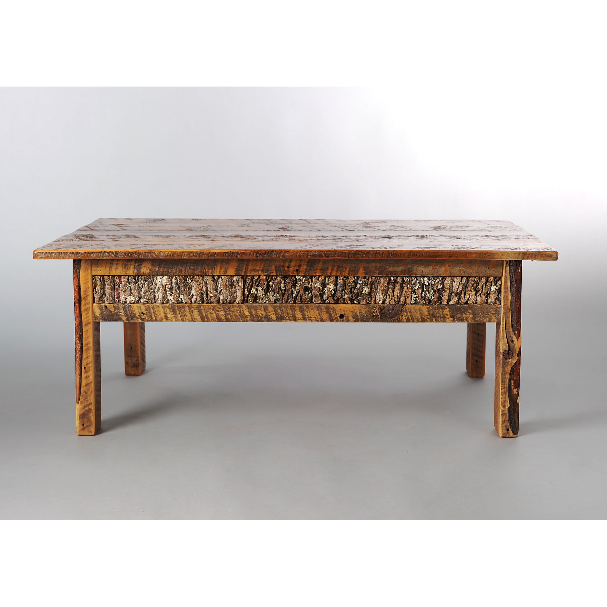 Intricate yet sturdy, the reclaimed wood coffee table with bark inlay is an eclectic focal point for the rustically inclined. Definitely a centerpiece that pays tribute to America’s past and today’s ingenuity. Constructed out of real American barnwood in Bozeman, Montana by the experienced furniture craftsmen of Four Corner Furniture. This reclaimed wood coffee table with bark inlay is the ideal combination of rugged and sophistication with its raw edged wood legs and detailed bark inlay. Unlike the cheap imports sold at your local big box retailer, our coffee table is built to last. Whether your home decor is strictly American rustic or eclectic boho, we’re certain this piece will satisfy your appetite for aesthetics. Stop waiting and invest in this reclaimed wood coffee table with bark inlay today – your living room will thank you.