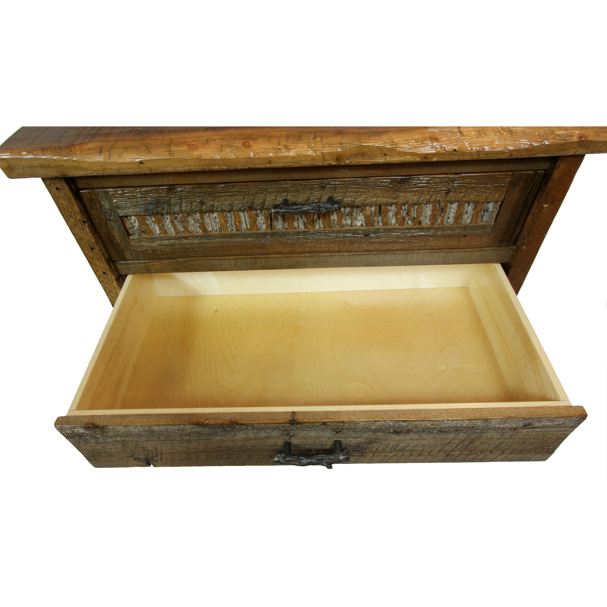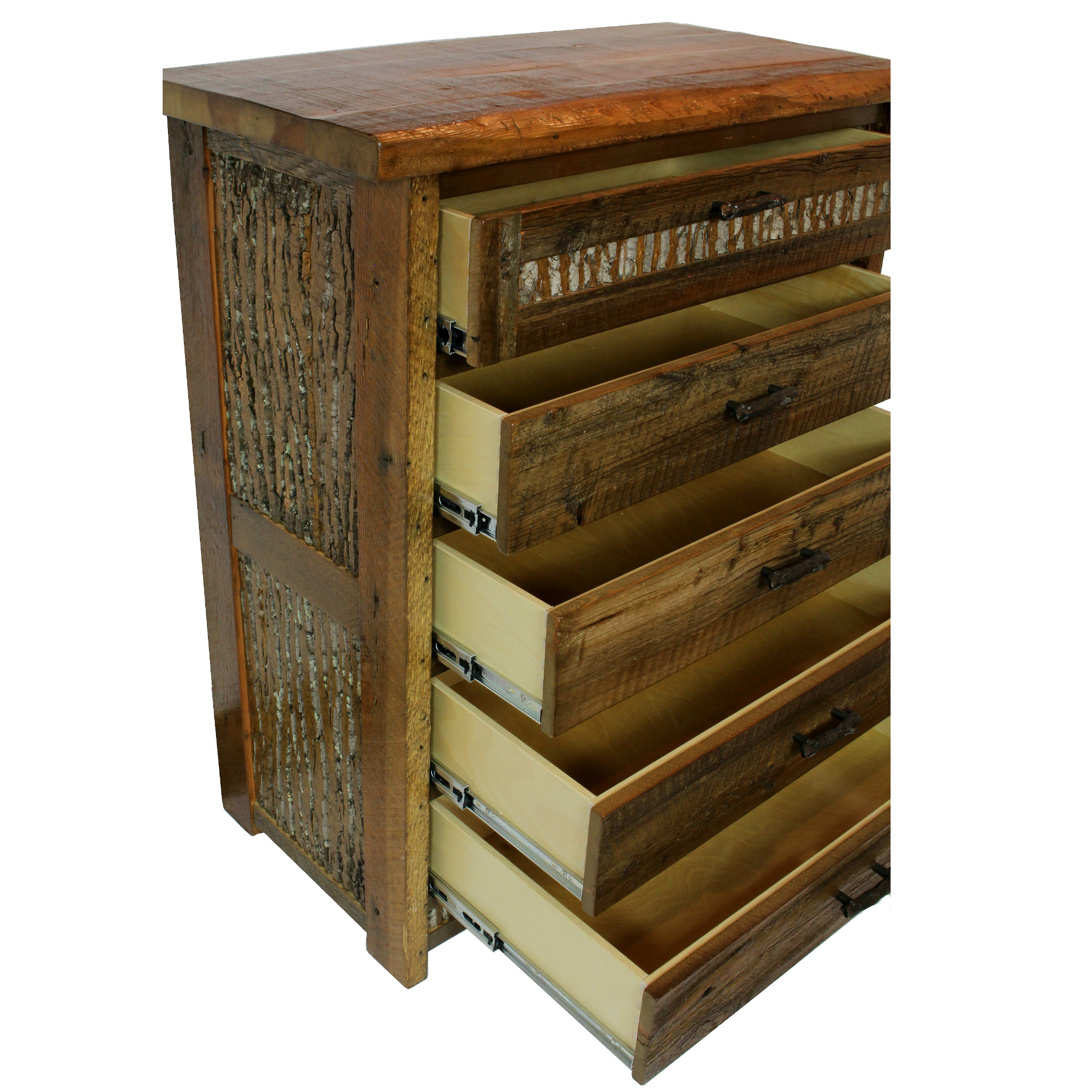 A true work of rustic beauty, this is our refined rustic chest of drawers from our Mountain Side line. It is made entirely out of reclaimed barnwood and features an eye catching bark inlay on the sides and near the top and bottom of this piece. The bark inlay adds visual depth to this chest while the natural beauty of the wood grain radiates rustic charm. Manufactured and designed by the dedicated team of expert furniture makers at Four Corner Furniture in Bozeman, Montana. The refined rustic chest of drawers offers both form and function and features plenty of storage space for your bedroom storage needs.