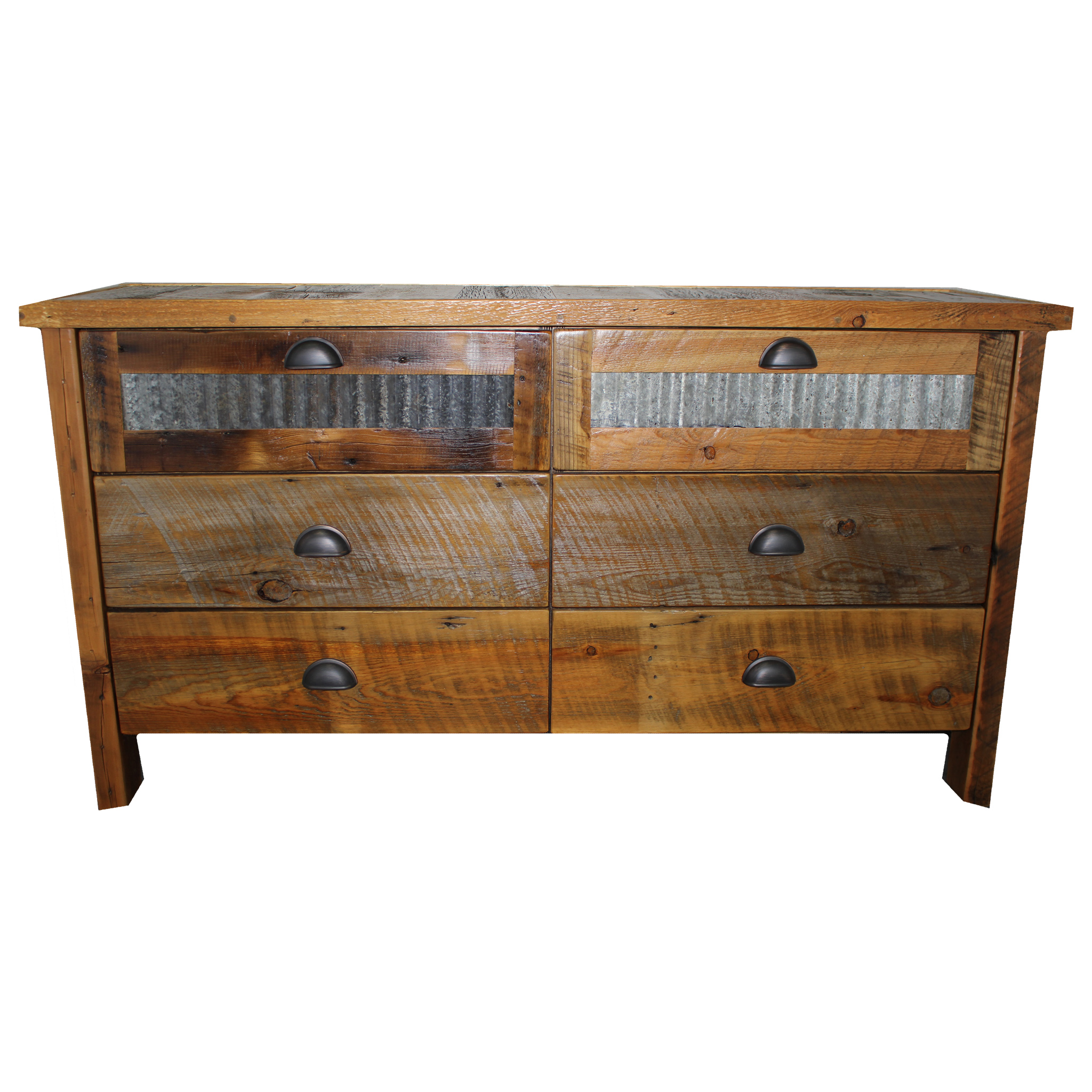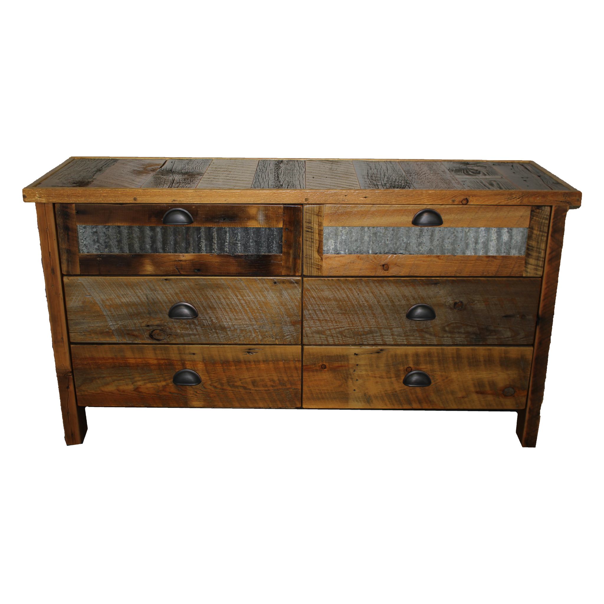 Rustic and functional, this dresser is the the perfect mix for the true rustic and practical visionaries. The rustic reclaimed wood dresser with metal is truly a piece you’ll adore having in your bedroom. Made out of american sourced reclaimed barnwood, this piece is truly one of a kind. It features six side by side drawers, a beautiful corrugated tin inlay, and comfortably sturdy oil rubbed bronze handles. The rustic reclaimed wood dresser with metal offers plenty of topside surface space for your bedroom trinkets. Crafted with painstaking attention to detail by the dedicated team at Four Corner Furniture, this rustic reclaimed wood dresser with metal is American designed and manufactured and ships to you from Bozeman, Montana.