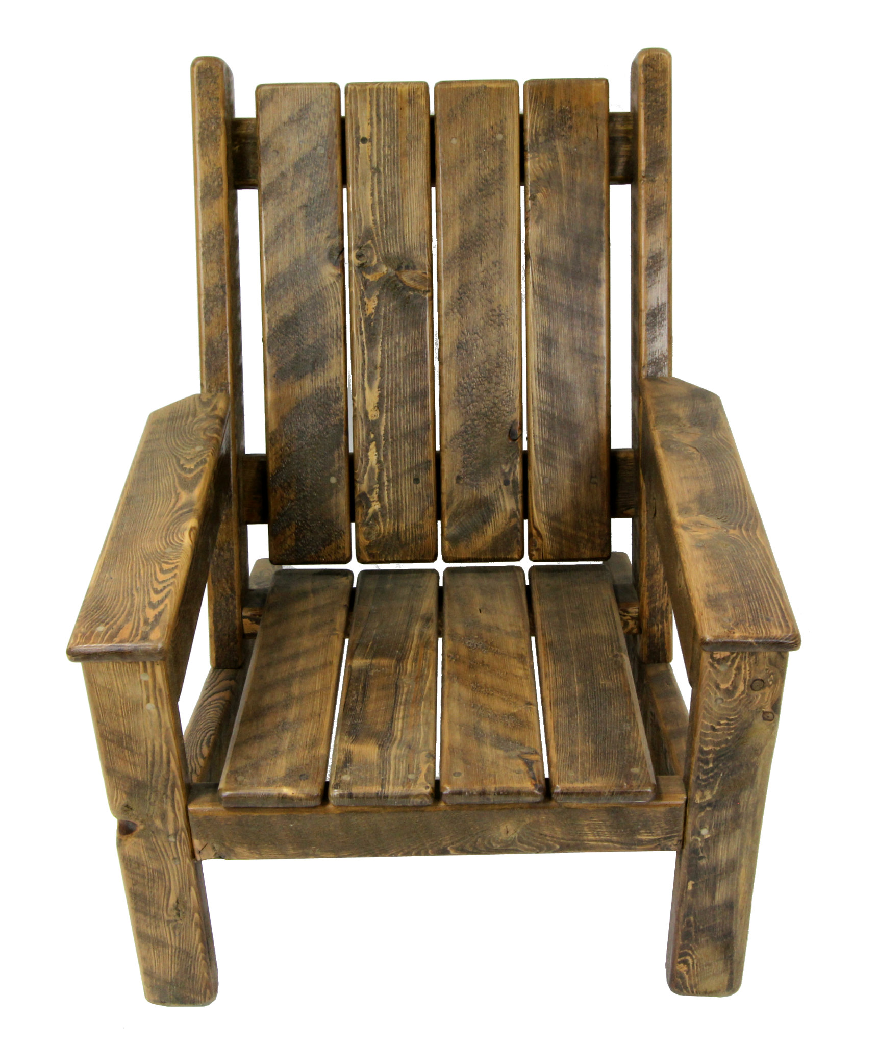 With the rustic wood Adirondack chair from Four Corner Furniture, your friends and family will love lounging around and relaxing outside in rural country style. Each chair in this design is a solid wood construction chair featuring a relaxed angle design and outdoor weather resistant finish. Our expert builders construct each chair out of circle sawn fir combined with new wood, only as needed, to ensure durability. As each chair is handcrafted and made to order, no two are ever exactly alike. Based in Bozeman, Montana, each rustic wood Adirondack chair, along with all the other furniture we make, is American designed and manufactured.+