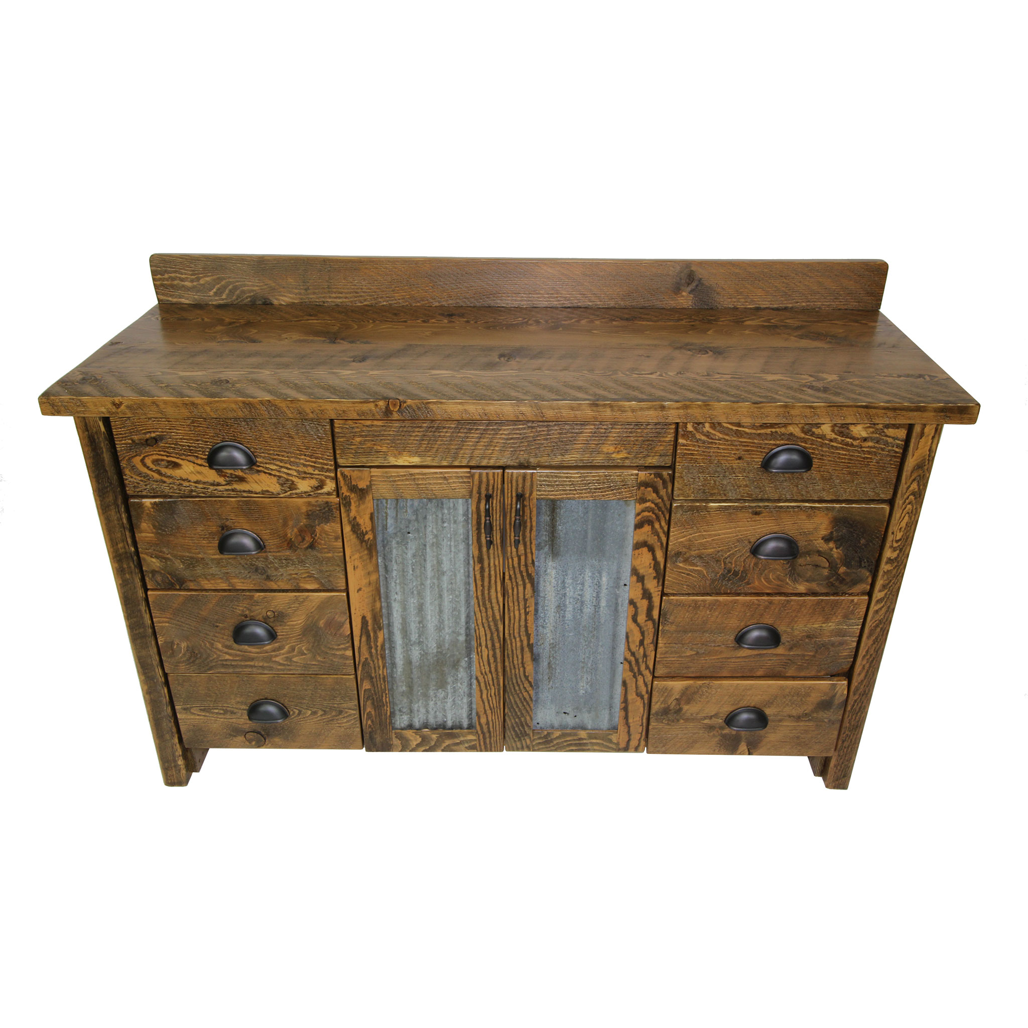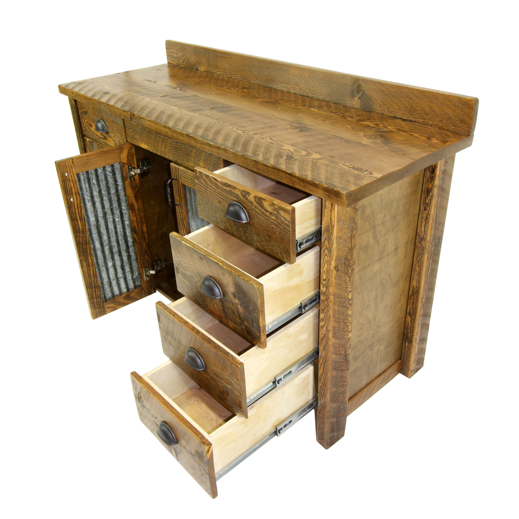 Few pieces of furniture can transform the look of an entire bathroom as effectively as a rustic wood bathroom vanity. Introduce any design and this vanity will go with almost every one. Our vanity, handcrafted to order by a team of expert furniture builders, is made primarily from circle sawn fir. To ensure durability for years to come, we reinforce the primary wood with new wood where appropriate, and further coat the entire piece in a pre-catalyzed lacquer finish. This finish also helps highlight the subtle brilliance of the source wood. Featuring a solid top design and cabinet area with two rows of drawers, this vanity also includes an open back inside cabinet for easy installation, as well as heavy duty soft close hinges on the cabinets and full extension ball bearing glides on the drawers. Proudly designed and manufactured in the USA, this rustic wood bathroom vanity is built to be both beautiful and long lasting.