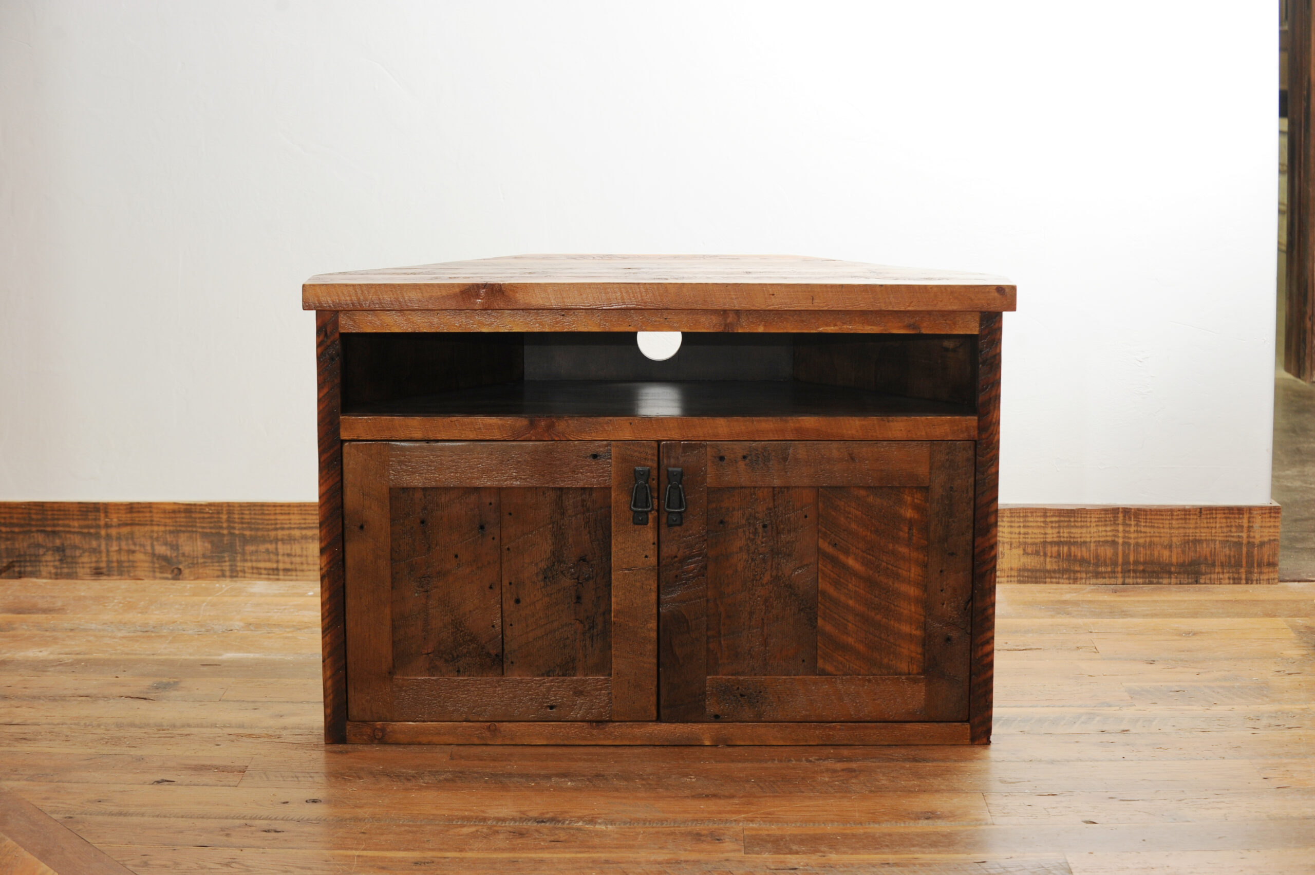 Functionality meets rustic with our rustic wood corner TV stand with storage. The TV is a focal point in most family rooms, and every focal point should be one your family enjoys looking at. Which is why we think you’re going to love this TV stand. Designed and manufactured in the USA by Four Corner Furniture in Bozeman, Montana. This rustic wood corner TV stand with storage features a wide top capable of supporting most modern flat screen TVs and a shelf with cabinets for your TV essentials. The wood is a combination of barn wood and new wood for structural durability. A pre-catalyzed lacquer finish further strengthens the stands structure and highlights the beautiful grain patterns of the source wood. In the tradition of fine craftsmanship, this rustic wood corner TV stand with storage is handcrafted and built to order; just like all the furniture we produce.